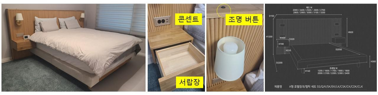 베이직가구[오크] A형 호텔 침대/협탁 세트는 촘촘하게 세로 라인으로 넓은 헤드 부분과 협탁에 있는 은은한 조명이 호텔 침구를 연상하게 합니다.